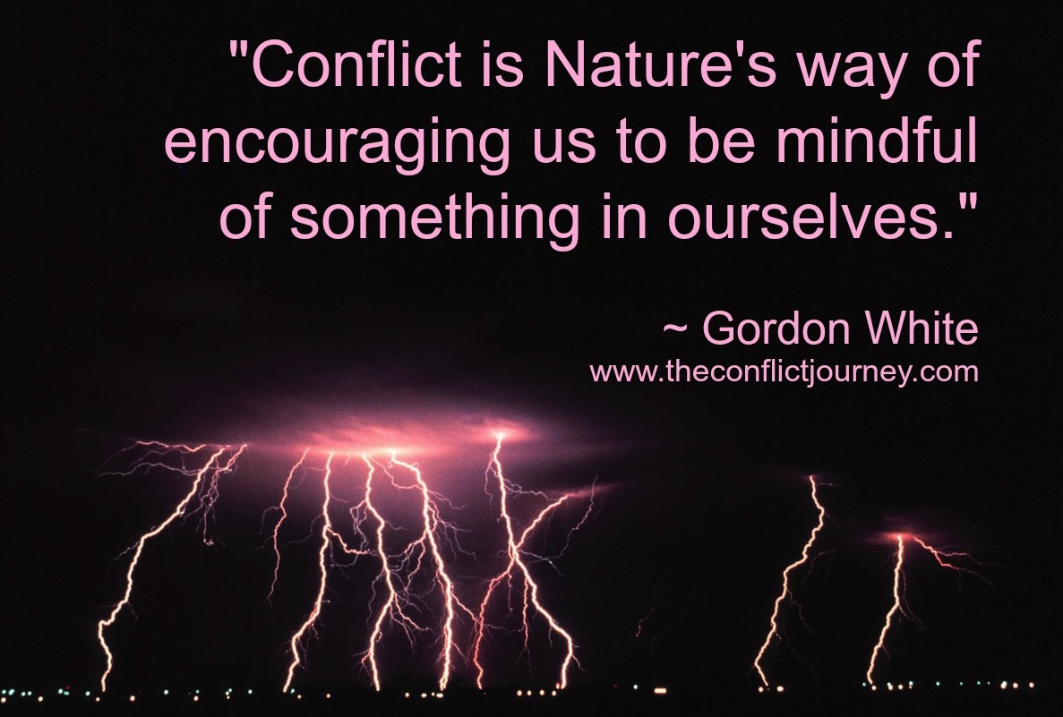 This second approach and worldview does not deny the first, but it does add a new avenue for responding. The conflict itself is viewed as meaningful, valuable, and in some sense spiritual. The conflict is Nature’s way, or if you like, the Creator’s way of forcing us to be mindful of something in ourselves that needs attention. Pain in the body draws our attention to physically caring for ourselves. Pain in the psyche including all the psychic and emotional discomforts of a conflict tries to draw our attention to the inner working of ourselves. We tend to miss the message by blaming out and finding fault with the other. But, look where the pain lies. It is a pain of the self, and perhaps that is where the discomfort suggests we look.