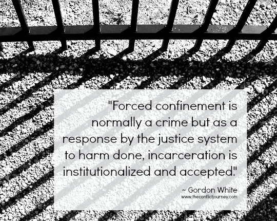 This practice runs deep into our psyches and is the core of what is understood to be justice. Forced confinement is normally a crime but as a response by the justice system to harm done, incarceration is institutionalized and accepted.