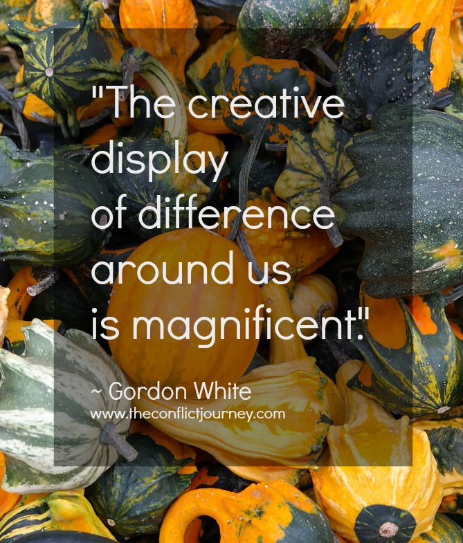 The creative display of difference all around us is magnificent. While engaged in conflict, we tend to view negatively the differences that are the basis of our conflict. We rarely appreciate the cosmic creative component of their origins.